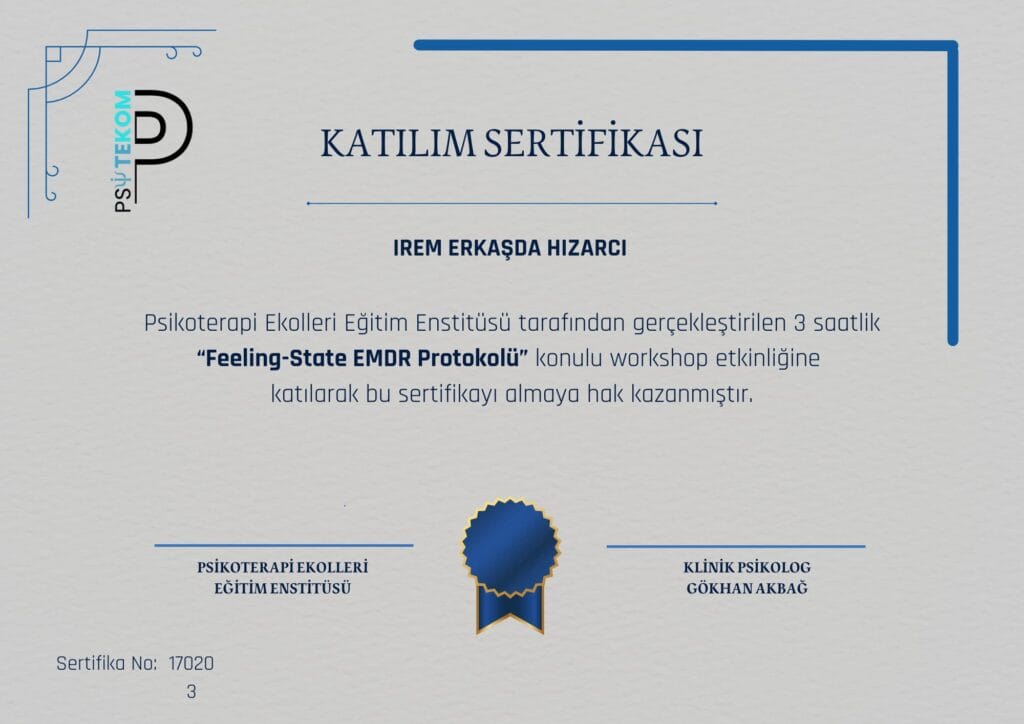 Göz Hareketleriyle Duyarsızlaştırma ve Yeniden İşleme (EMDR) yaklaşımı üzerine tamamlanan teorik eğitim, uygulama ve süpervizyon çalışmaları.